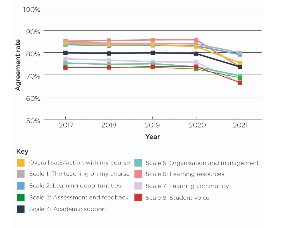 The NSS was launched first time in 2005. The structure, content, and methodologies of the survey have evolved significantly since then. Over the past decade, the NSS has undergone notable revisions. Following extensive consultations since 2015, a new NSS was introduced in 2017, incorporating nine new questions related to student engagement and modifying existing questions on assessment, feedback, and learning outcomes. Further reviews of the survey instruments took place in 2020. The pandemic’s impact was reflected in subpar NSS results, with students nationwide expressing dissatisfaction with teaching and learning practices, access to accommodation, and other university services. Figure 1 illustrates a decline in NSS scores across all categories during the pandemic. Many observers at the time noted that students felt inadequately supported by their institutions. In the autumn of 2020, several universities unexpectedly closed their student accommodations due to the spread of the virus, leaving many students stranded. Additionally, the sector lacked substantial experience in remote learning and assessment, further negatively impacting students’ experiences, pastoral care, and overall performance.